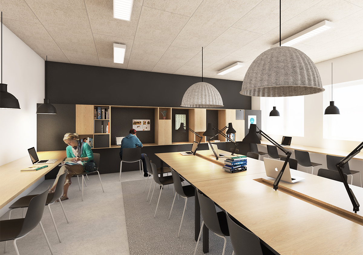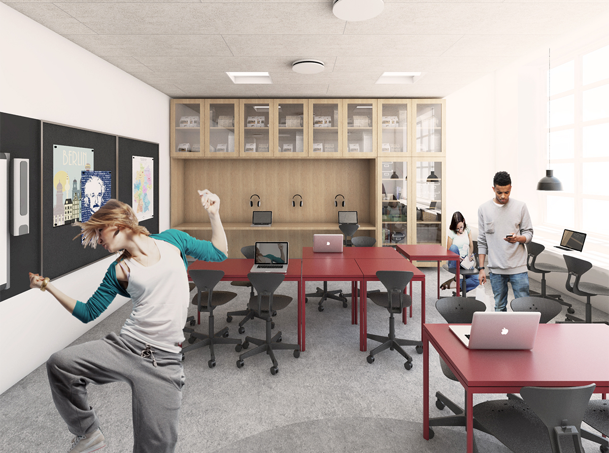 I dansk og sprogfagsværkstederne varierer undervisningen meget, lige fra individuel fordybelse til produktions- og bevægelsesorienteret arbejde. Derfor er rummene meget alsidigt indrettet, men mulighed for at give plads til disse mange arbejdsmetoder.